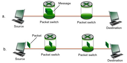 Figure for P10: End-end message transport: (a) without message segmentation; (b) with message segmentation.